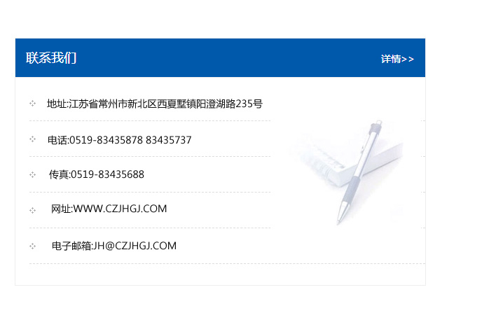 地址:常州市新北區友邦商務大廈1幢16、17層  電話:0519-85101652  傳真:0519-85112595  郵編:213022  網址:www.cz-jiayue_cn.bjhdbjy.com  郵箱:xiajifengaa@163.com
